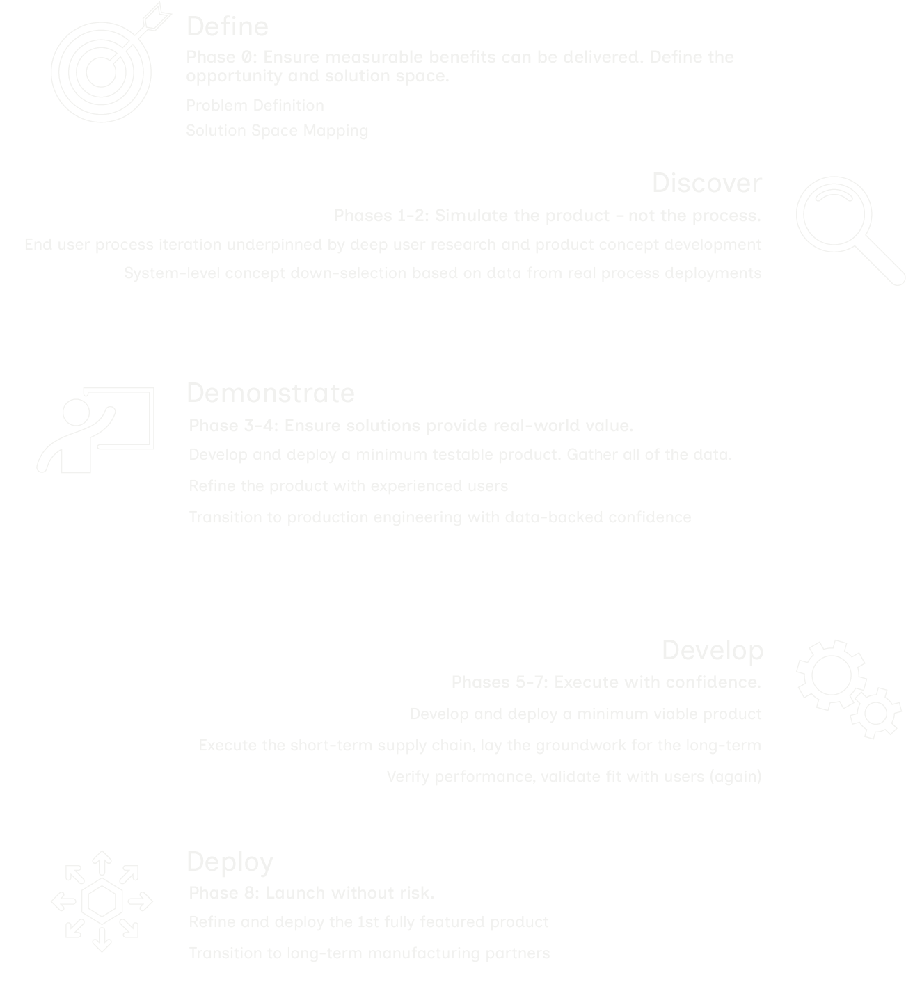 Our process front-loads validation, uncovering the challenges that typically surface in beta or production, after significantly more capital has been expended. We target a late-stage risk profile with early-stage equity dilution, preserving both control and upside for the founding team and early investors.